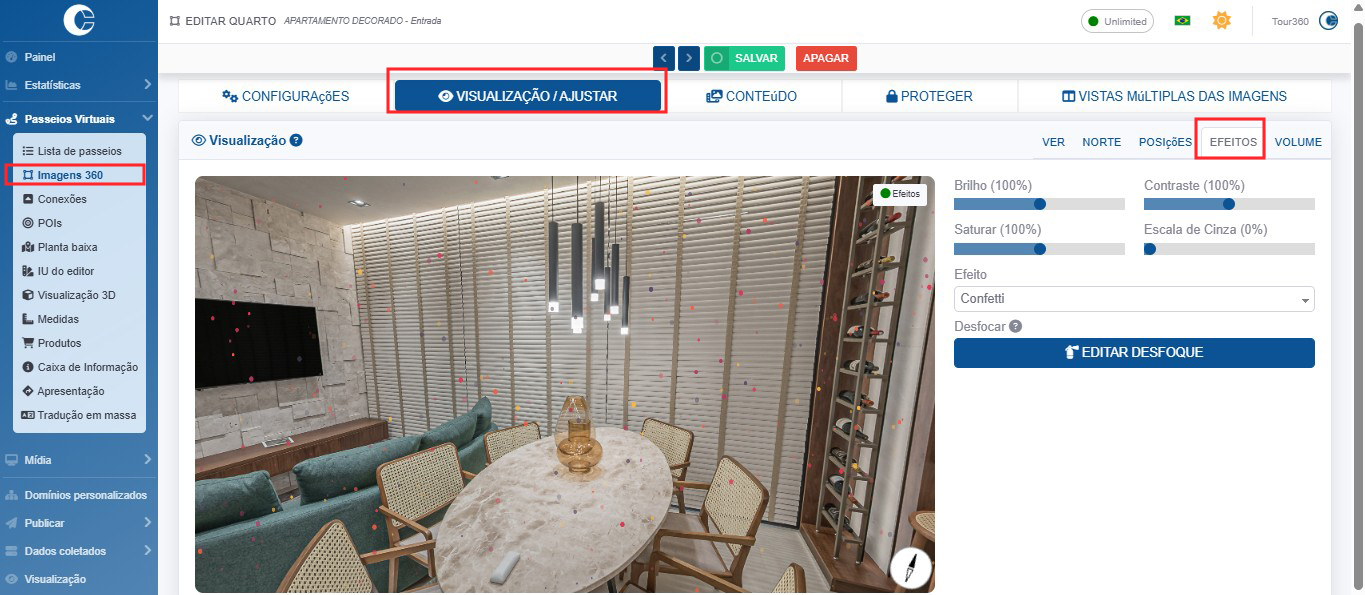 Aqui você pode alterar algumas configurações de exibição panorâmica, como brilho , contraste , saturação e escala de cinza .