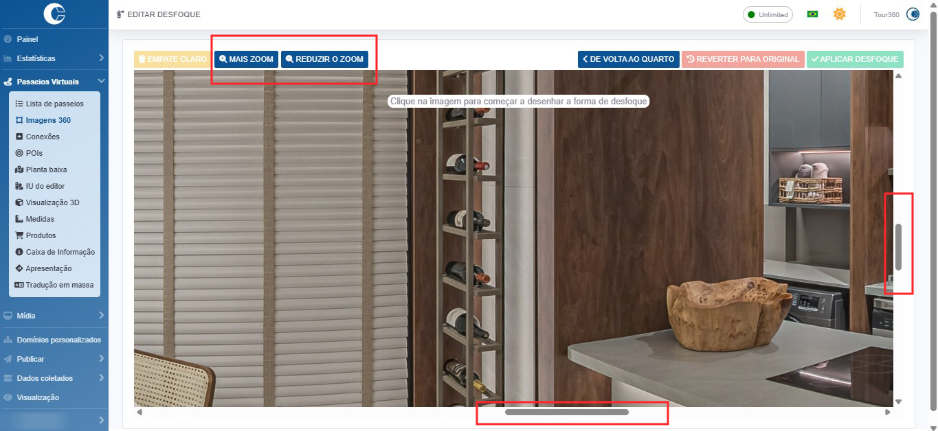 Mova as barras de rolagem e os botões de zoom para encontrar a área que você precisa desfocar.