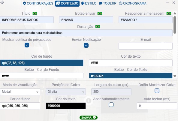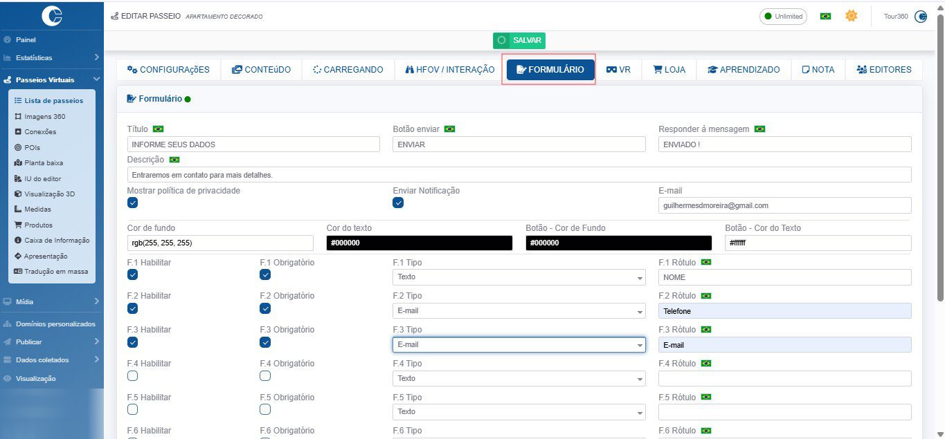 •Campos: habilite os campos de seu interesse, definindo se são obrigatórios e definindo o tipo (texto, e-mail, caixa de seleção, etc)