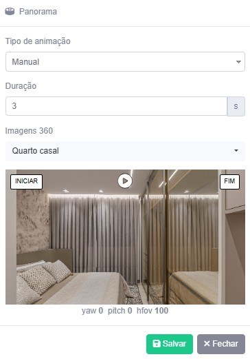 Este slide conterá uma animação de um panorama do passeio. Para criar a animação, selecione o ponto inicial e final do panorama clicando nos botões correspondentes.
