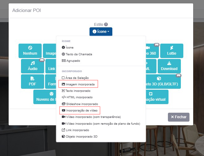 Um pop-up é aberto e lá você pode selecionar o estilo do POI como imagem incorporada ou vídeo .
