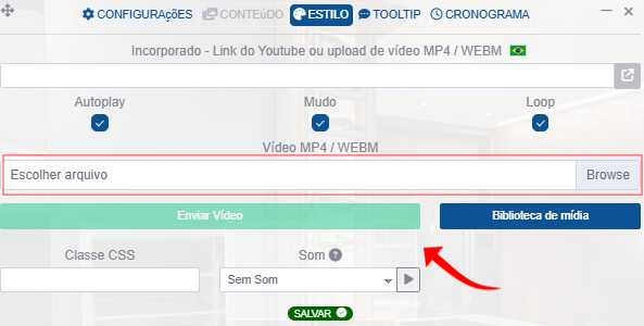 Se você optou por incorporar um vídeo, clique no botão Procurar , carregue o vídeo do seu disco e clique em Carregar Vídeo para iniciar o upload. Ou você pode inserir um link para um vídeo do YouTube no campo Conteúdo. Você também pode definir se o vídeo deseja iniciar automaticamente, com áudio ou sem, e em loop ou não.