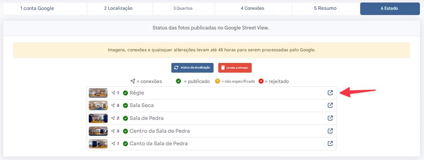 status na seção final. Aqui você pode visualizar o status de cada sala publicada e pode clicar no botão