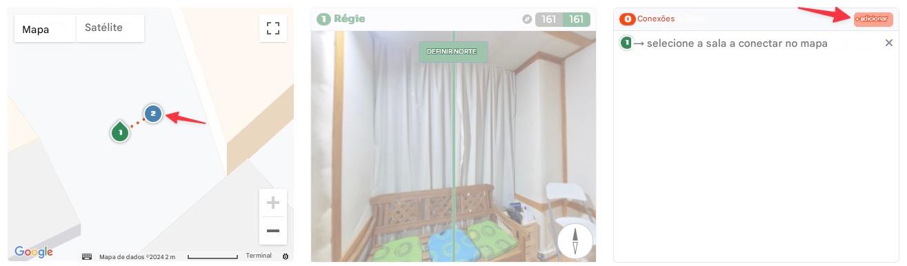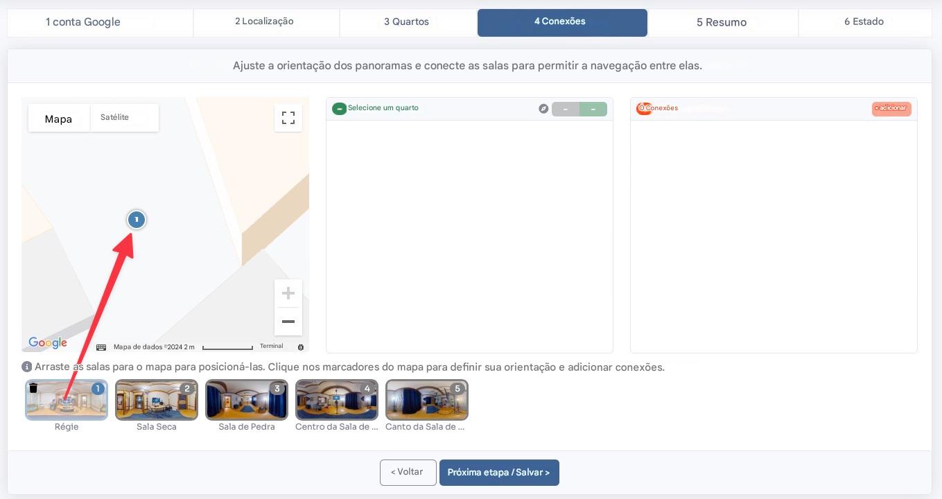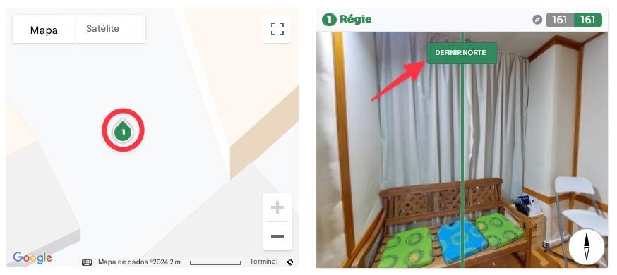 Clique em cada sala no mapa e atribua a direção correta definindo o norte, arrastando a visualização de 360 graus para a direita e pressionando o botão